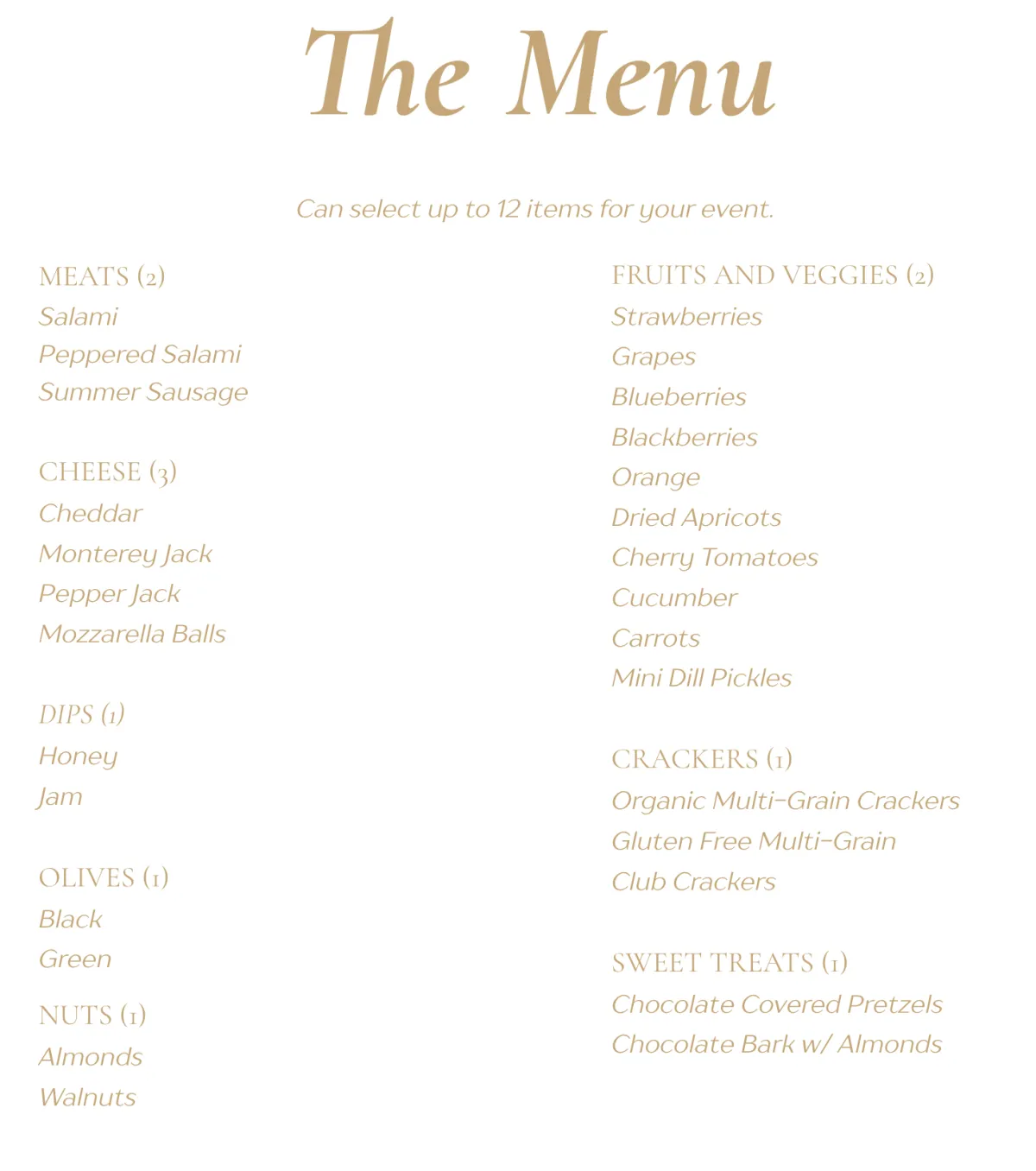 All ingredients, full styling, two hours of bottomless grazing, a customizable 12-item menu, serving boards for your guests, decor to match your event theme, and setup/cleanup.
